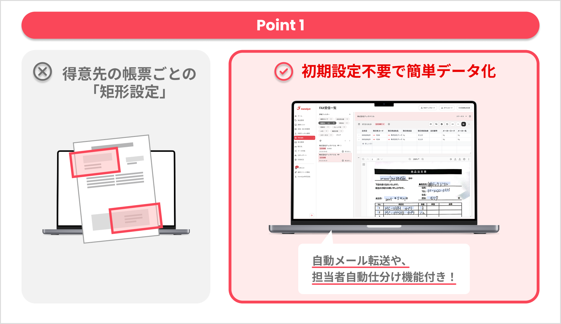 - 一般的なFAX-OCRでありがちな得意先の帳票ごとの「矩形設定」は必要なく、手書きであっても簡単にデータ化できます。