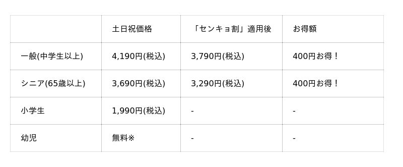 ※2「平日学割」は学生証ご提示の本人に限り有効です。「平日価格」・「平日学割」はキャンペーン開催期間中の土日・祝を除く平日のみが割引適用となります。「平日価格」の対象は一般・シニア料金のお客様です。