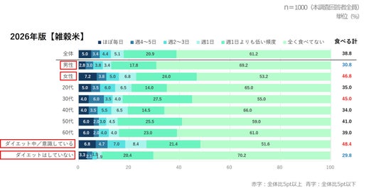 玄米の2026年版をみてみると、【30代】では「食べる計」が36.5%と全体より5pt以上高くなっている一方で、【60代】や【ダイエットはしていない層】では、食べている人が2割~2割強にとどまり、全体より5pt以上低い結果となった。