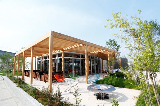 柏の葉T-SITE内、ロッジをイメージしたウッディな空間にはライブキッチンを備え、ペット同伴可能席やフラットシート、暖炉付き半個室、テラス席など、さまざまなシーンでご利用いただけます。