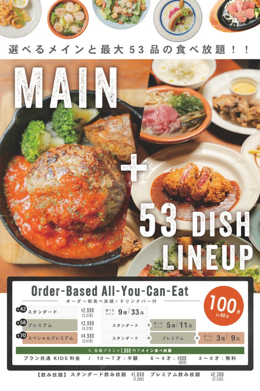 当店名物の肉汁溢れるハンバーグをはじめ、溶岩石で焼き上げるステーキなどのメイン料理を1品選択。旬野菜を使用したサラダや、洋食のサイドディッシュ、グラタン、スープ、デザートまで、最大53品が食べ放題となる新プランです。