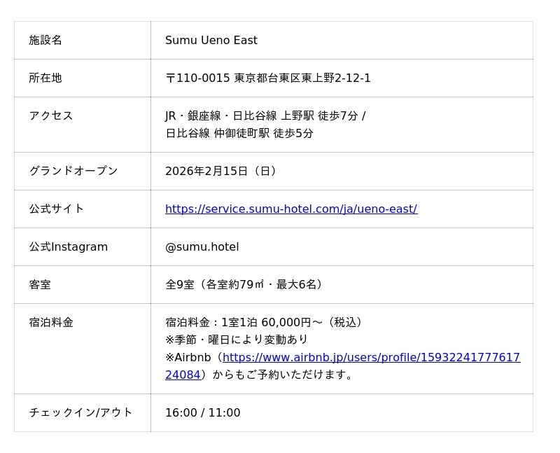 ADDReC株式会社(本社:東京都新宿区、代表取締役:福島大我)がブランディング、ビジネスデザイン、設計・デザイン監などの統合プロデュースを担当する実験型アパートメントホテル「Sumu powered by Airbnb Partners」は、この度、0号店となる「Sumu Ueno East」を2026年2月15日(日)、東京・東上野にグランドオープンいたします。
