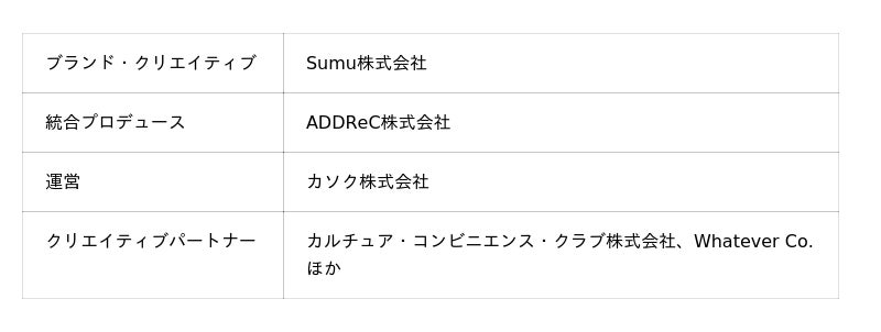 ADDReCは、Sumuの統合プロデュースを担当し、プロジェクト全体のブランディング・デザイン監修を行っています。Airbnb Partnersの参画企業を中心として、それぞれの専門性を持つパートナー企業が力を合わせて生み出すプロジェクトとして、Sumu株式会社がブランドのコアとなるクリエイティブとIPを担い、カソク株式会社がアパートメントホテル運営を担当。Whatever Co.がロゴやステートメント、ブランドサイトの制作を担っています。そして実店舗となるアパートメントホテルの空間づくりやコンテンツ制作には、物件ごとに異なるクリエイティブパートナーが参画します。【Sumu Ueno Eastのパートナー企業】