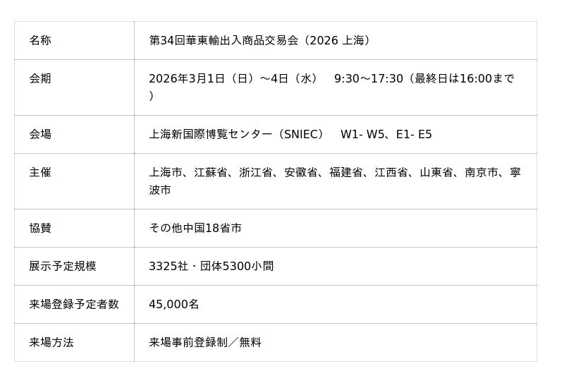 第34回華東輸出入商品交易会は 2026年3月1日~3月4日、上海新国際博覧センターにて開催されます。本展の展示総面積は11万5000平方メートルで、服装服飾展、紡績生地展、家庭用品展、装飾・ギフト展、海外製品エリア、越境EC展示エリアを含む構成となっています。
