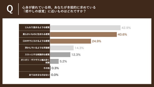 「心身が疲れている時、あなたが本能的に求めている『癒やしの感覚』に近いものはどれですか?あてはまるものを全てお選びください。(複数回答)」と聞いたところ、「口の中でとろける感覚(24.9%)」と「柔らかいものに包まれる感覚(40.6%)」に回答が集まりました。一方で、「噛み砕く(発散)」や「刺激」といった能動的なアクションを求める声は0.5~1割にとどまりました。このことから、疲れている時は何かを“する”のではなく、安心して「身を委ねられる体験」が求められていることが分かります。