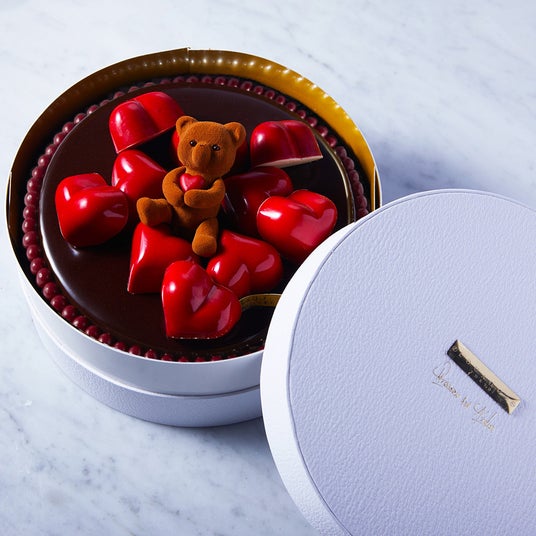 真っ赤なギフトボックスを開けると、ハートを抱えたヌーミーが顔をのぞかせるサプライズ。濃厚なチョコレートケーキの美味しさとヌーミーの愛らしさが、贈り物にもぴったりです。