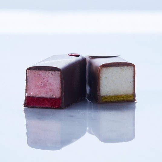 ギモーヴのもっちりとしたやさしい食感と、パート・ドゥ・フリュイのジューシーな果実感を、独自の二重構造で重ね、チョコレートで丁寧に包み込みました。外側はパリッと軽やかに、中はもっちりとした口あたりが広がる、新しい食感のコントラストが魅力です。5種類の繊細な素材が織りなす、特別な味わいをお楽しみください。