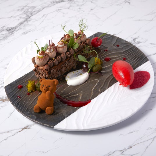 また、銀座の「LOUANGE TOKYO Le Musee」では、バレンタイン限定のデザート「ガトー フォレ・ノワール バレンタイン2026」も登場。いちごソースを添えたガトーショコラをフォレ・ノワール風に仕立てました。食いしん坊のヌーミーと真っ赤なハートが可愛らしい特別な一品です。