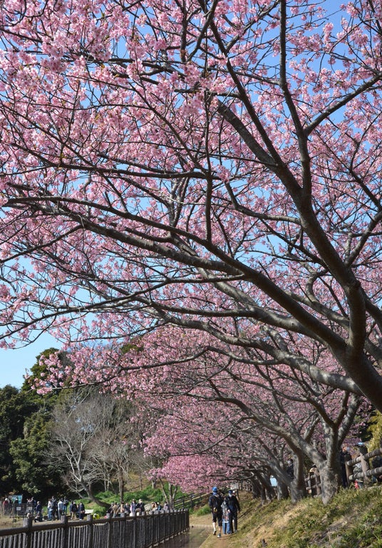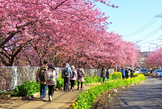 三浦半島で「桜」と言えば、まず名前が挙がるのが河津桜。京急線・三浦海岸駅から線路沿い1キロにわたり、約1,000本の河津桜が植えられており、電車を降りた瞬間から、やわらかなピンク色の景色が広がります。