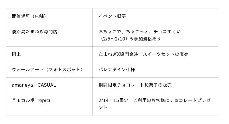 バレンタインは「大切な人と特別な時間を過ごす」というテーマ性が強く、淡路島が持つ“非日常の体験価値”と非常に親和性があります。ショッピング、グルメ、景観といった多様な楽しみ方を組み合わせることで、来訪者の回遊を促し、淡路島全体の活性化につなげることを狙いとしています。