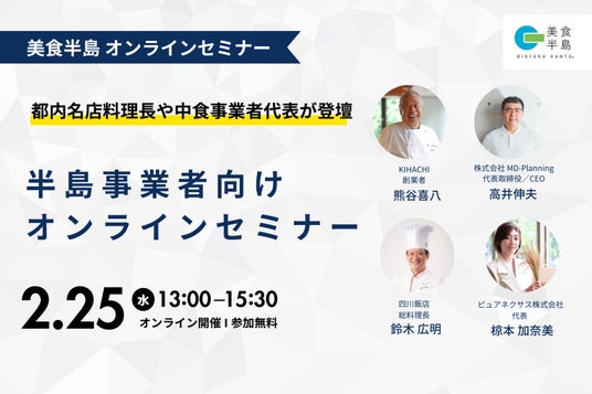 2月25日に半島の事業者様に向けて、都内の名店料理長や中食・小売の現場で勤務経験がある方々をお招きし、 取引がどのように始まり、どのように継続していくのかをお話しするオンラインセミナーを開催します。「どんな食材が選ばれるのか」「事業者側は何を準備しておくべきか」半島産品の魅力を「伝わる形」で届けるための実践的なヒントをお持ち帰りいただけるセミナーです。