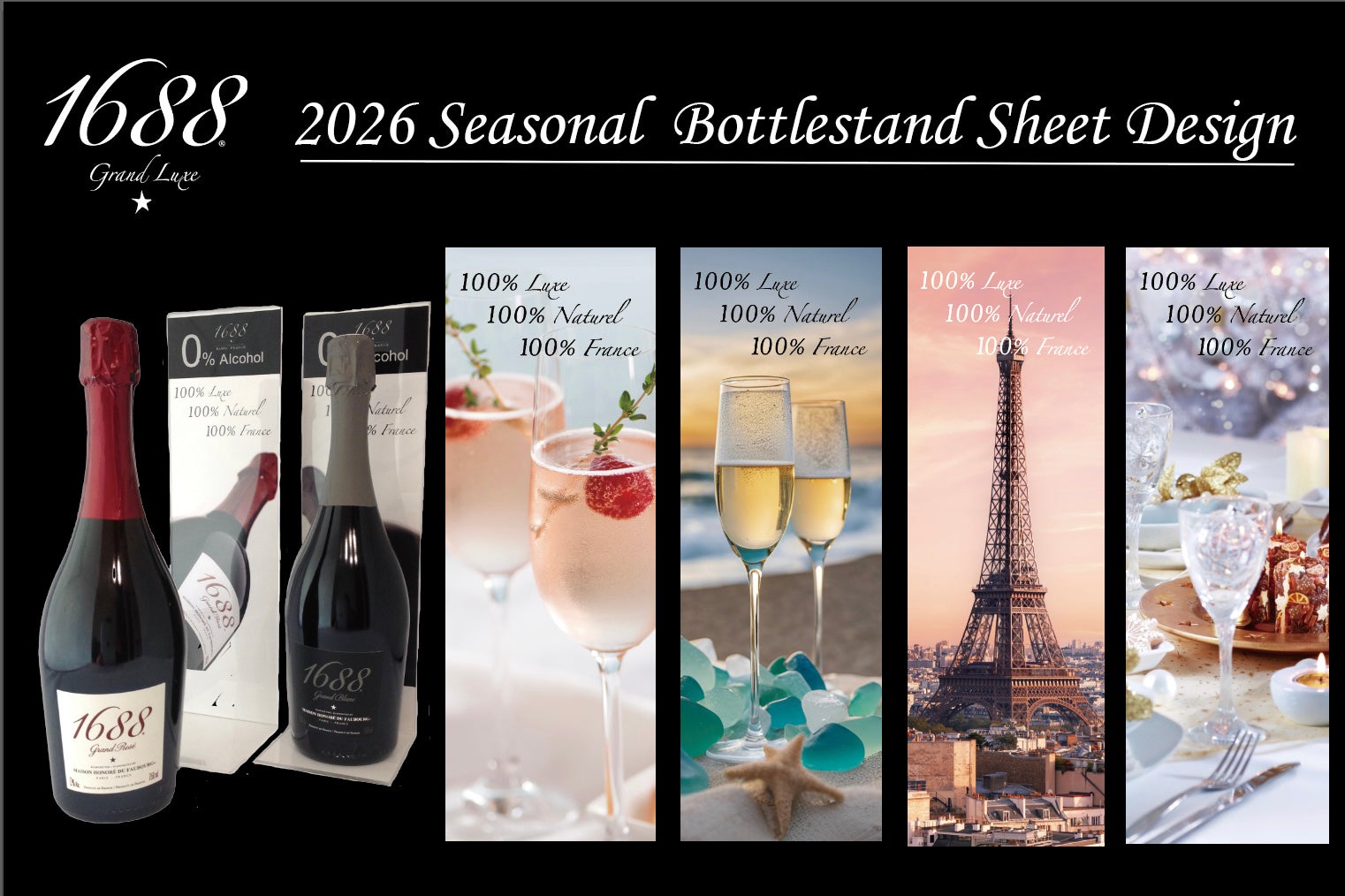 【1688特製 ボトルスタンド】2026年4シーズンシートは、ボトルスタンドの背面に挟んでご使用いただけます。展示用のダミーボトルもご提供いたします。