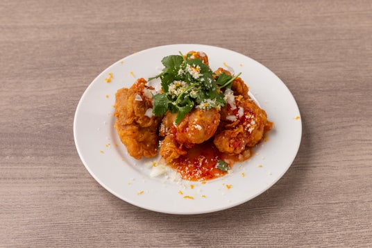 オレンジチリソースで、甘酸っぱさとピリ辛さが食欲をそそるベースの味つけをし、パクチーの爽やかな香りが全体をグッと引き締め、エスニックな余韻をプラス。最後に加えるホワイトチョコが熱々のチキンでとろけるチョコが酸味をまろやかに包み込みます。