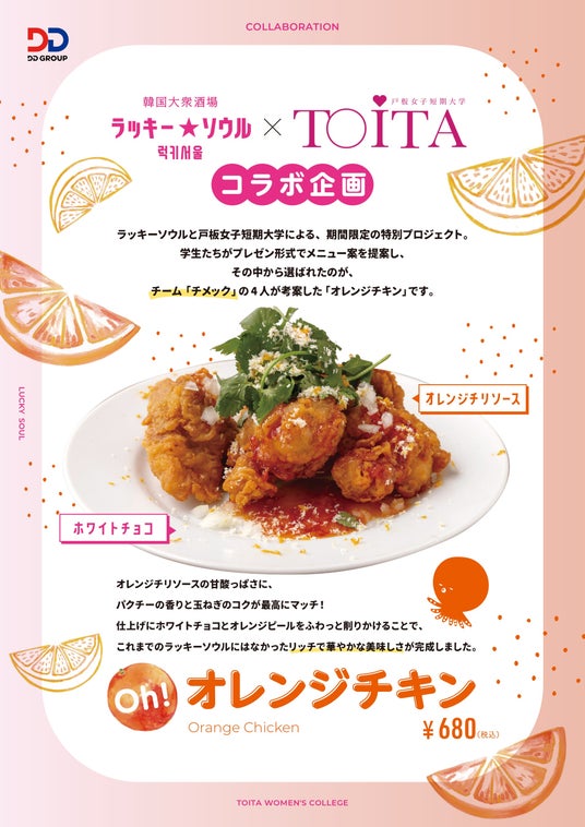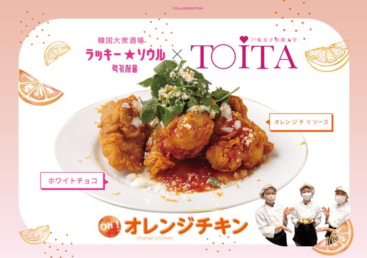 株式会社ダイヤモンドダイニング(本社:東京都港区、代表取締役社長:松村 厚久)が運営する「韓国大衆酒場 ラッキーソウル」は、戸板女子短期大学(東京都港区)との産学連携プロジェクトにより誕生した、バレンタインシーズンに向けた驚きの新メニュー「Oh!オレンジチキン」を、2026年2月1日(日)より期間限定で販売開始しました。