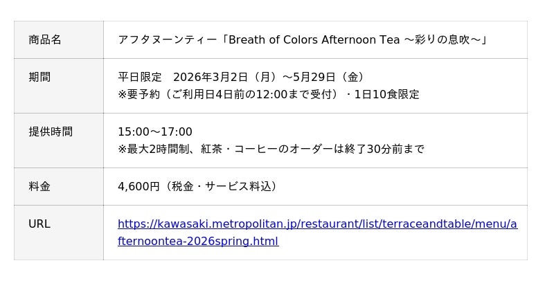 ホテルメトロポリタン 川崎(運営/日本ホテル株式会社、総支配人/金田 文典)の直営するオールデイダイニング「Terrace and Table」では、2025年3月2日(月)より新作アフタヌーンティー「彩りの息吹(Breath of Colors Afternoon Tea)」を平日限定にて提供し、本日よりご予約を開始いたします。