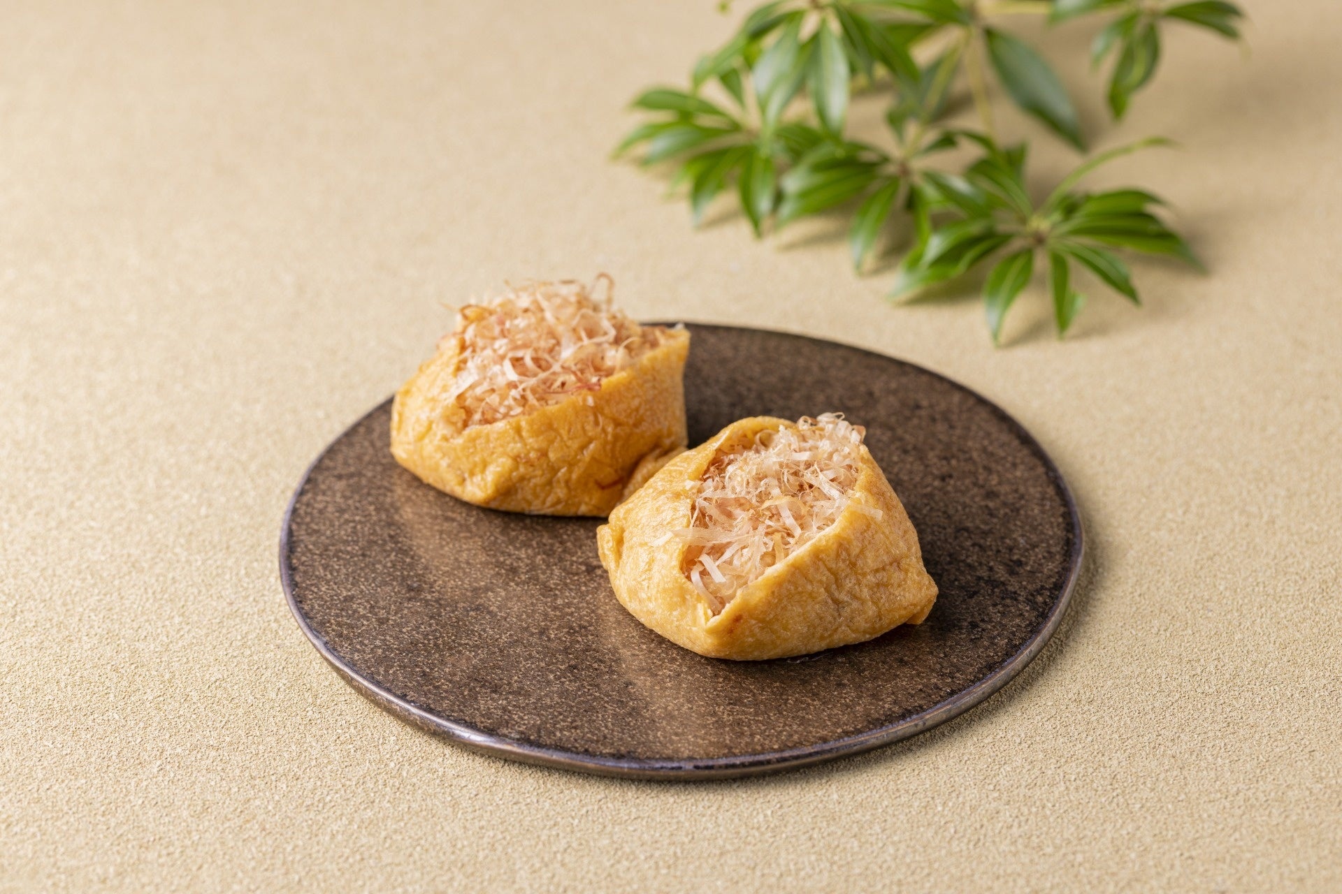 しなやかでキメ細かな餅に糸カツオをまぶし、甘辛く炊き上げたいなり揚げで包みました。