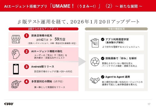 ぐるなびは、従来の料理ジャンルや予算などを細かく指定し、自ら「検索して探し出す」というユーザーの手間を解消し、AIエージェントが最適なお店を提案する次世代の食体験提供を目指し、AIエージェントアプリ「UMAME!(うまみー!)」を運営しています。