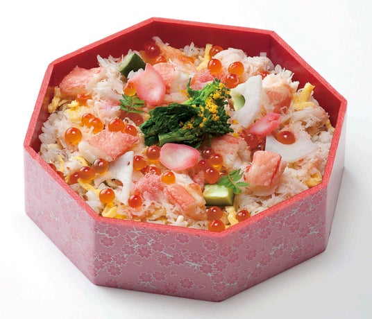 内容:ずわい蟹・イクラ・錦糸玉子・菜の花・きゅうり・酢蓮根・花びら百合根・桜でんぶ