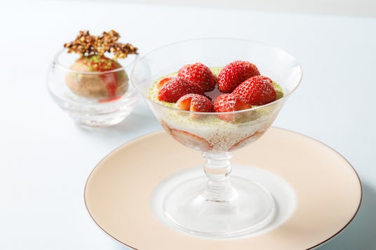 ▼フォンテーヌブロー・フレーズフロマージュブランとシャンティクリームを合わせたフランスの伝統的菓子「フォンテーヌ・ブロー」を、「ル・ショコラ・アラン・デュカス」スタイルで。中には、ザクザクのココナッツとヘーゼルナッツのショコラ、ローストしたイチゴを忍ばせました。トップには、フレッシュなイチゴとライムゼストをのせ、春を感じる彩りで仕上げました。