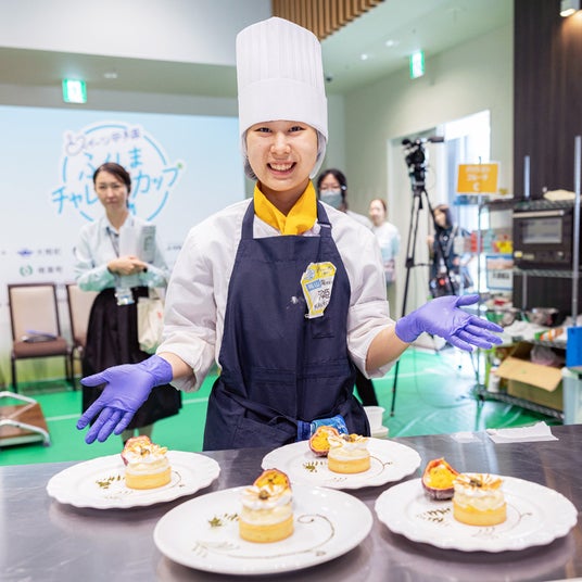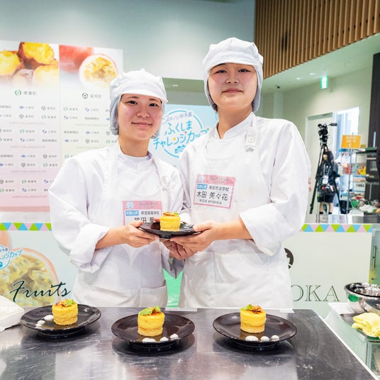 【スイーツ甲子園 ふくしまチャレンジカップ】 高校生パティシエ日本一を決める「スイーツ甲子園 高校生パティシエNo.1決定戦」(主催・産経新聞社)の姉妹コンテストとして開催。東日本大震災と原子力災害からの復興応援を目的に、大熊町のキウイ、富岡町のパッションフルーツ、楢葉町のサツマイモ、広野町のバナナのおいしさと魅力を多くの人に知ってもらおうと、昨年8月に福島県にあるサッカー日本代表のナショナルトレーニングセンター「Jヴィレッジ」で決勝大会が行われました。