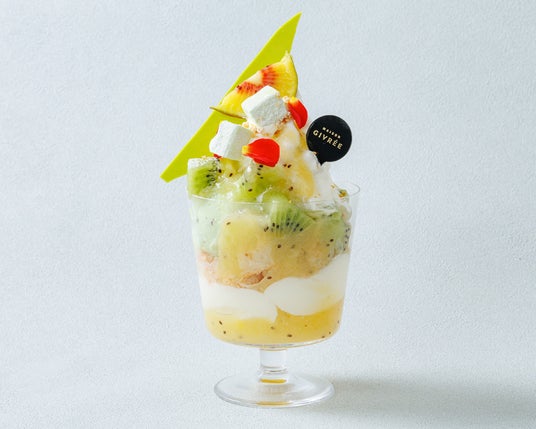 【大熊町】3種のキウイのパフェ仕立て【大熊町賞】国際TBC調理・パティシエ専門学校(栃木県)・黒崎翔太さん×MAISON GIVREE(メゾンジブレー)オーナーパティシエ・江森宏之 / ゴールドキウイのソース、ミルクパンナコッタ、キウイシャーベット、ミルクソフトクリームを重ね、キウイのギモーブ(マシュマロ)をとトッピングした盛りだくさんの一品です。