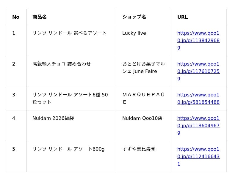 Qoo10の「洋菓子」ランキングでは、リンツ「リンドール」のアソート商品が数多くランクインしました。多様な味わいを堪能できる大容量セットが注目されています。