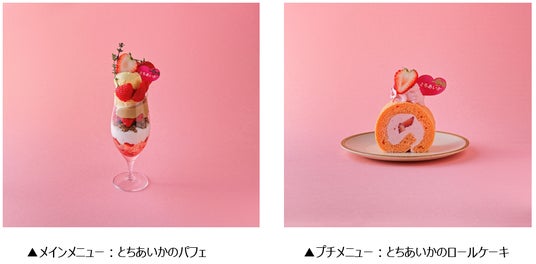 販売されるコラボスイーツメニューは、各店舗2品。満足感のあるメインメニューとお食事の後にもお楽しみ頂けるプチメニューをご用意いたします。パフェやパンケーキ、タルトなど、とちあいかを使用した見た目も豪華なオリジナルスイーツです。