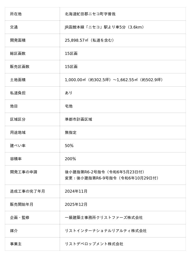 本分譲地は2023年に用地を取得後、造成工事の計画を進め、2024年11月に工事完了となり、この度、15区画の別荘用地として販売を開始しました。販売窓口は、リストグループで富裕層向け不動産仲介を行うリスト サザビーズ インターナショナル リアルティが担います。