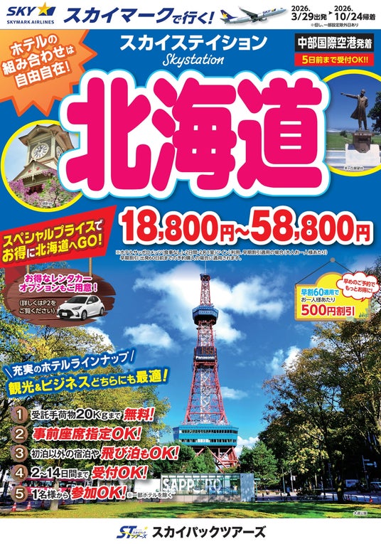 スカイパックツアーズ株式会社(本社:東京都中央区、社長:横山正巳)は、スカイマークの航空券とホテルがセットになった旅行商品(ダイナミックパッケージ)『たす旅』の2026年3月29日(日)出発~2026年10月24日(土)帰着分の販売を1月27日(火)に開始しました。
