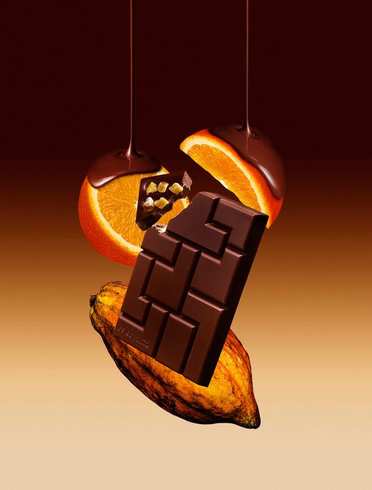 ベースはCACAO HUNTERS(R)?のコロンビア・シエラネバダ産カカオのビターチョコレート(カカオ分64%)を使用。コロンビア北部、標高5,000m級のシエラネバダ山脈麓に広がる熱帯雨林で採れたトリニタリオ種のカカオで、ベリー系の鮮やかな酸味と赤ワインのようなタンニンを感じる味わい。その裏面には、オレンジ果汁を濃縮したソフトグミを散りばめました。