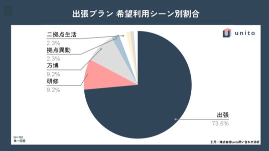 法人企業からの問い合わせ内容を分析したところ、73.6%と大多数が「出張」での利用を希望していることがわかりました。従来の短期宿泊ではなく、当社が提供するような「中長期の滞在」を出張に取り入れる企業の動きが活発化しています。