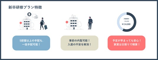 そこで解約日を日割り計算することのできるマンスリーマンションを運営する当社ならではの強みを生かし、「新卒研修プラン」を提供する運びとなりました。