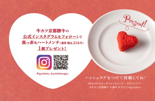 対象期間中、牛カツ京都勝牛の公式Instagramをフォローしていただいたお客様に感謝の気持ちをこめて「真っ赤なハートメンチ~ぎゅうかちゅっ~」を無料でプレゼント!