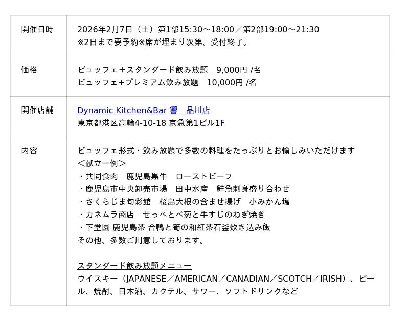 また、Dynamic Kitchen & Bar 響 品川店では2月7日(土)限定で鹿児島県の食材を使用したビュッフェ料理を堪能していただく1日限定イベントを開催いたします。