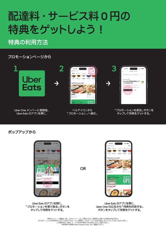 ※5 Uberは、その任意の裁量で、事前の予告なくいつでも本プロモーションを変更、延長または終了する権利を有しております。また、店舗の都合などにより、事前の予告なく変更・終了する場合があります。