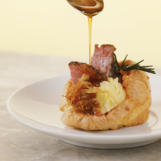ヨークシャープディング外はカリッと中はふんわり焼き上げた生地に、ローストした和牛、スモークマッシュポテト、こんがりとキャラメリゼしたオニオンを合わせたエンバ・キョウト・グリルらしさを映し出したヨークシャープディングは、シェフ原田の一押しです。