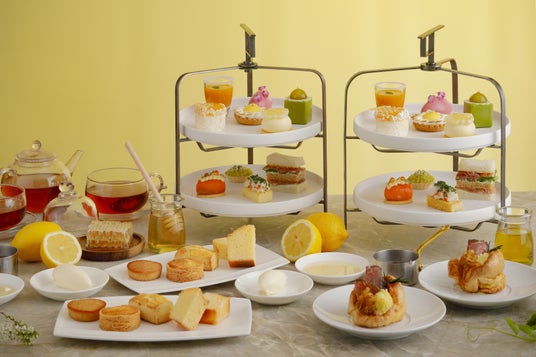 鮮やかな黄色をメインにパステルカラーで彩られるスタンドには、6種類のスイーツ、5種類のセイボリー、そして4種類の焼き菓子が並びます。さっぱりとしたレモンの風味と、まろやかなはちみつの甘さに春の食材を加え、華やぎを感じていただけるメニューを取り揃え、心躍る優美なティータイムをお届けします。