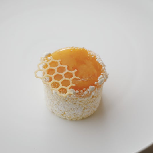 トップにはハチの巣を型取ったクッキーをのせ、柑橘の明るい酸味と、軽い口当たりが春らしさをお届けします。