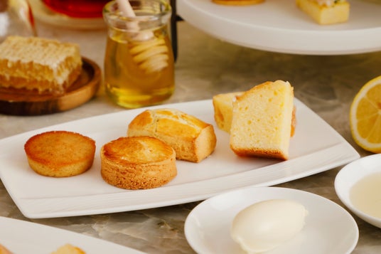 左から順にフィナンシェ、ハニーガレット、バニラスコーン、レモンパウンドケーキ ※アカシアハニーとクロテッドクリームはそれぞれ小皿でご用意いたします。