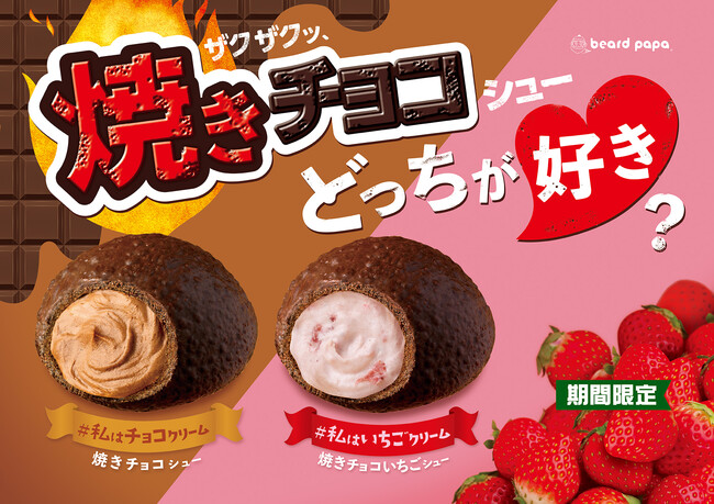 株式会社麦の穂(本社:大阪府大阪市北区、代表取締役:杉内 健吉)は、シュークリーム専門店ビアードパパにて2023年2月1日(水)より期間限定で“焼きチョコシュー”を販売いたします。チョコづけをして二度焼きした焼きチョコシュー生地は、ザクザクと食べ応えのある食感。選べるクリームは、濃厚でくちどけの良いチョコクリームと、コク深く甘酸っぱい苺クリームの2種類。お好みに合わせて選べる味わいをぜひお楽しみください。
