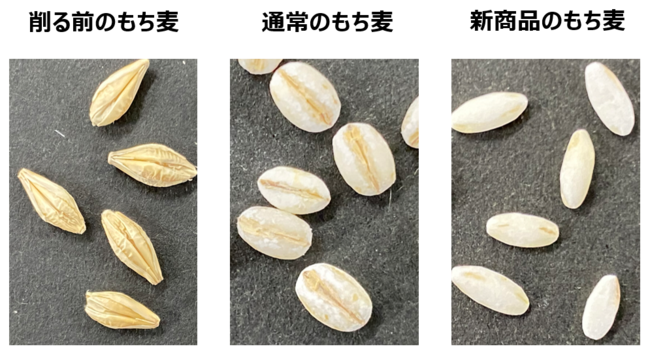 しかし当社が持つ精麦技術により、0.01mm単位で削りを調整することで、割れることなく見た目も食感もまるで白米のような白いもち麦を開発しました。
