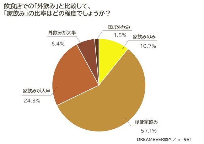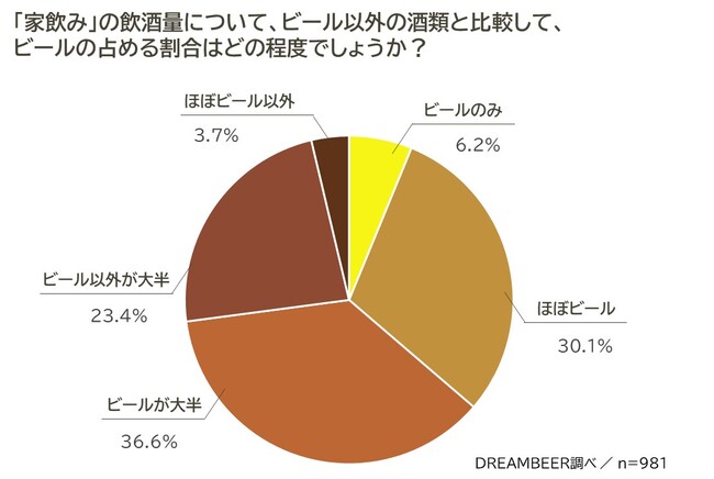 「家飲み」にビールが占める割合は、ビールが大半もしくはそれ以上の解答が70%を超え、根強いビール人気を示しました。一方で日頃ビール以外の酒類を飲用している27%の層にもドリームビアを導入いただいていることが分かり、普段あまりビールを飲まない顧客層にもクラフトビールは浸透しつつあることがうかがえました。