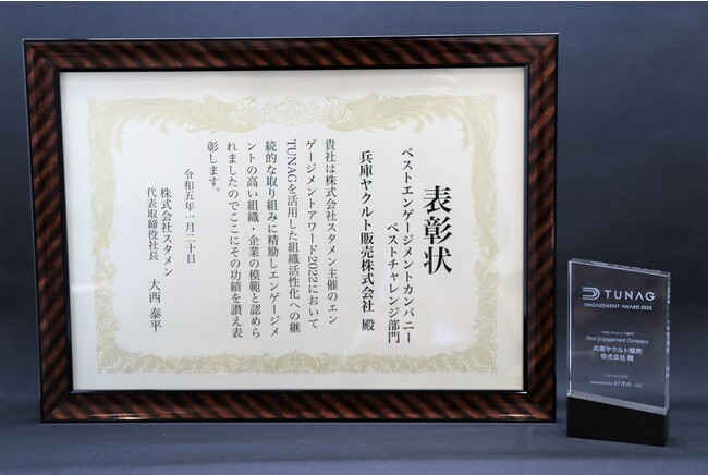 兵庫ヤクルト販売株式会社は、1月20日(金)開催『エンゲージメントアワード2022』の授賞式に参加いたしました。本アワードは、TUNAG導入企業を対象に、社内のエンゲージメント向上のために先進的・効果的な取り組みを行う企業が表彰されるもので、兵庫ヤクルト販売が「ベストエンゲージメントカンパニー ベストチャレンジ部門」を受賞いたしました。