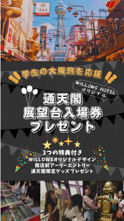 株式会社日本ユニスト(大阪市、代表取締役・今村亙忠)が運営する「Willows Hotel 大阪新今宮」(大阪市浪速区)は、卒業旅行や学生旅行でお泊まりになる学生の方を対象に、通天閣展望台に行列へ並ばずに入場できる特別チケットと、通天閣オリジナルグッズをプレゼントするキャンペーンを実施します。※宿泊対象期間は3月22日まで(土曜日・連休中日除く)