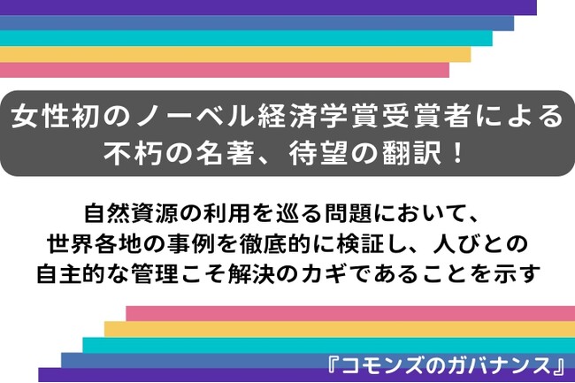 近年の消費拡大によりこれらの資源に枯渇の危機が迫っており、適切に管理されることが求められている。本書では、これらの天然資源に由来する地域資源を、人びとがどのように管理し利用しているか、成功した管理、失敗した管理を、事例研究を通じて理論化。そこからは、利用する当事者自身が協力してルールを設定し、現実に応じて柔軟に運用する姿が見えてくる。従来、資源(コモンズ)の安定的な管理には、政府の介入か私有化しかないという定説に異を唱え、人びとによる自治が着目されるさきがけとなった不朽の名著、待望の邦訳。