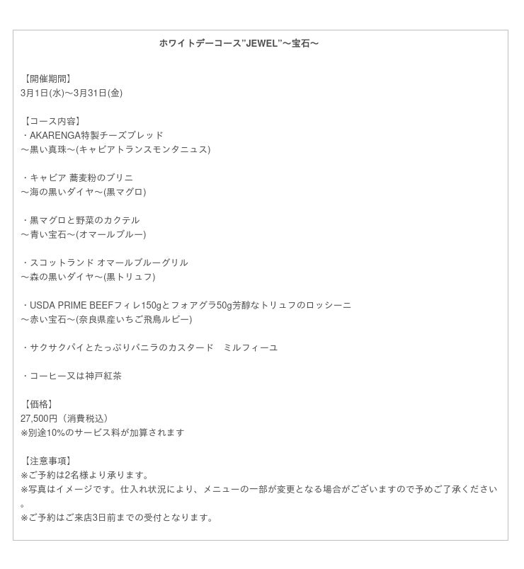 AKARENGA STEAK HOUSEでは3月限定で「”JEWEL”~宝石~」をテーマにし、ホワイトデーディナーを華やかに彩る限定コースが登場いたします。