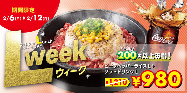 株式会社ホットパレット(本社:東京都江東区、代表取締役社長:松本純男)が運営するペッパーランチは、2月6日(月)~12日(日)の期間中、ビーフペッパーライス(またはお肉たっぷりビーフペッパーライス)とソフトドリンクの各Lサイズのセットがお得になる「L WEEK」を2月キャンペーン第1弾として開催いたします。