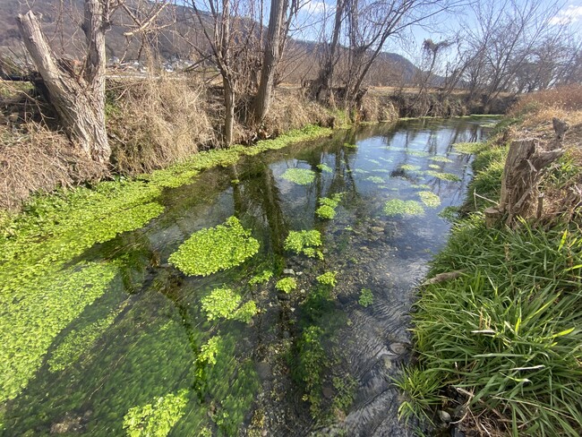 わさび畑の湧き水は集まって川に流れていくのだが、透明度がすごい。冬でなければ今すぐにでも飛び込みたいくらいに綺麗だった。