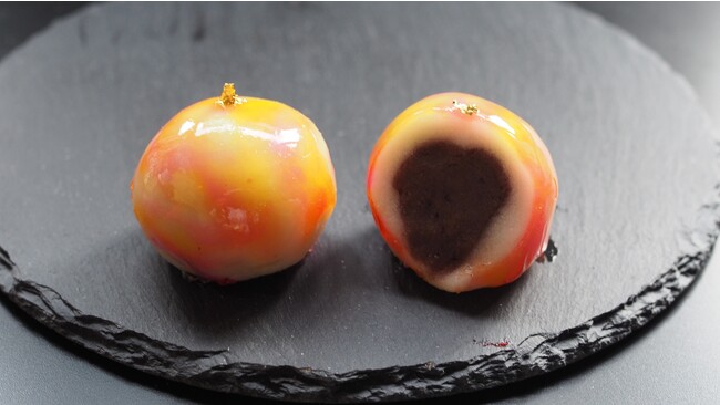 白餡に柔らかい餅を混ぜ込み粘りを出した練り切り餡で中はこし餡が包餡されています。白色の練り切り餡を丸型に成形し、上から赤と黄色に染めた寒天を流しました。固まる前に一つ一つ混ぜ合わせて宝石のように美しいマーブルに仕上げます。