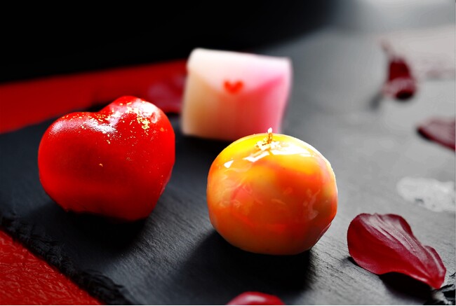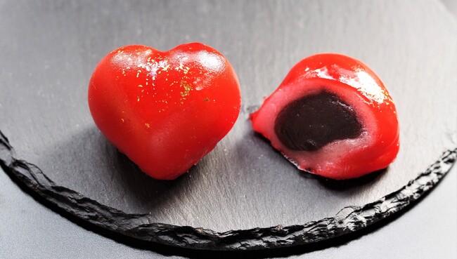 【求肥餅に赤羊かんをかけて、チョコのようなハート型の上生菓子】